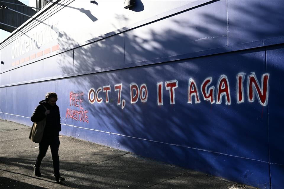 In Fitzroy in Melbourne, pro-Palestinian graffiti appeared to mark the anniversary:“Glory to Hamas”,“Oct 7, do it again”,“Glory to the martyrs”.