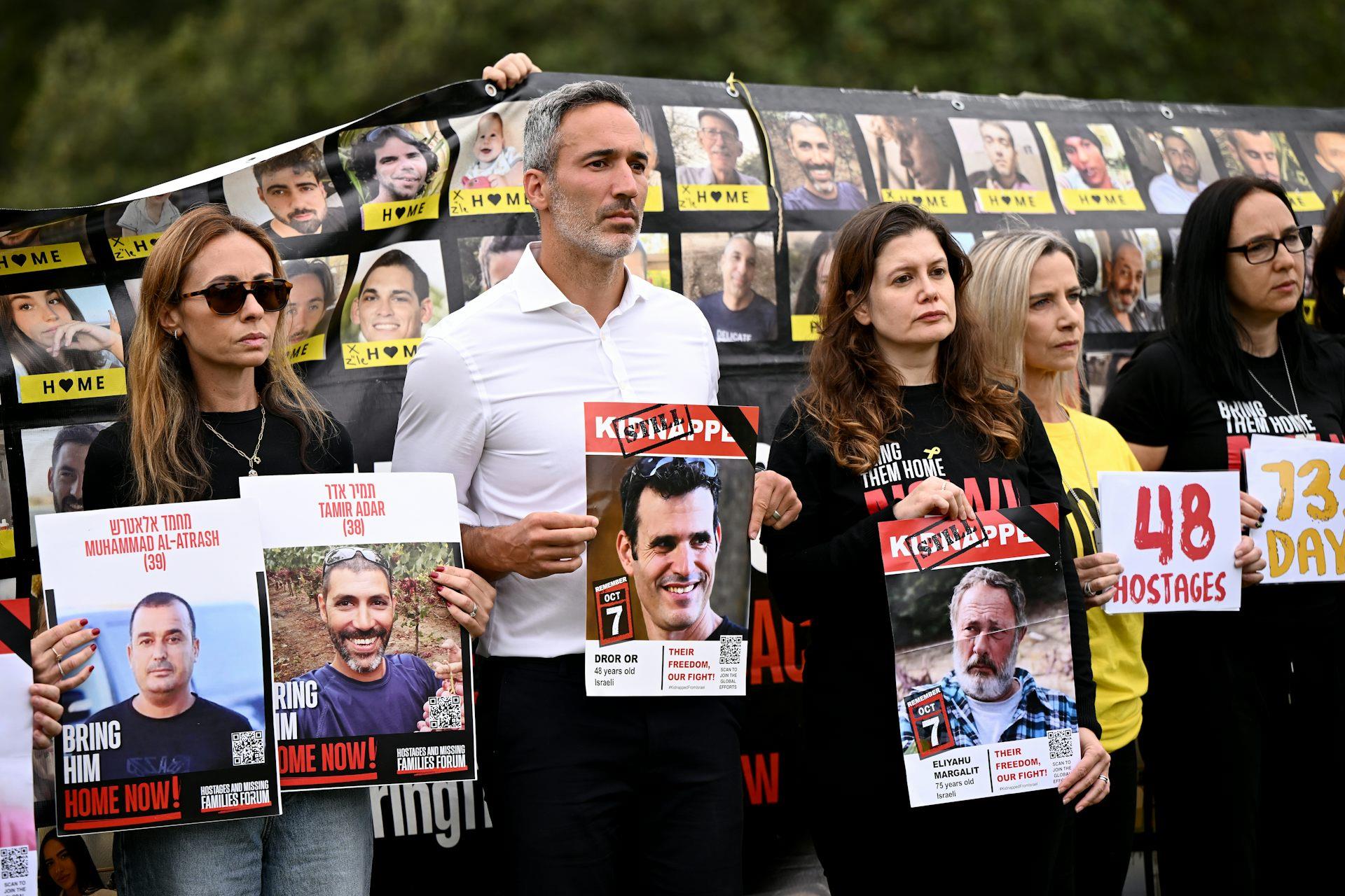 Executive Council of Australian Jewry co-CEO Alec Ryvchin (centre) joins protestors as the hold placards of Israeli hostages following a press conference marking the two-year anniversary of the Hamas terrorist attacks against Israel. Bianca De Marchi/AAP