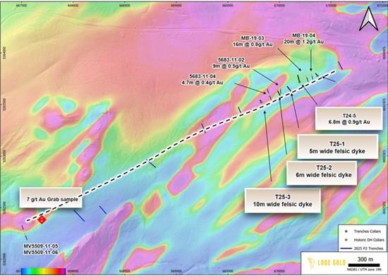 The assays from selected grab samples from the trenching program show results of up to 6.1 g/t Au and 6.9 g/t Au in trench T25-1 (Figure 2). The soil geochemical survey, conducted to fill in over areas not previously covered, continued to prove to be an excellent field vectors to pursue more advanced work in this environment.