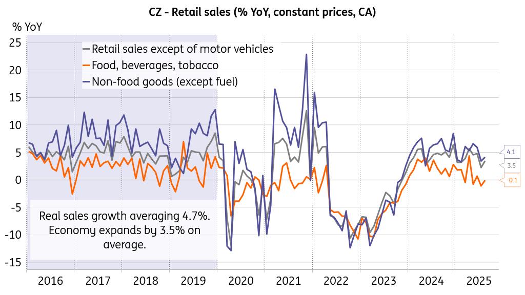 Czech real retail sales added 3.5% year-on-year and 0.6% month-on-month in August, with the annual dynamics stronger than market participants had expected. Sales of motor vehicles gained 8.1% YoY and 0.2% MoM. Real sales of fuel increased by 10.9% YoY and of non-food goods by 4.1% YoY, while food sales declined by 0.1% YoY. Sales grew in all product groups in non-food stores, except for stores selling computer and communication equipment.