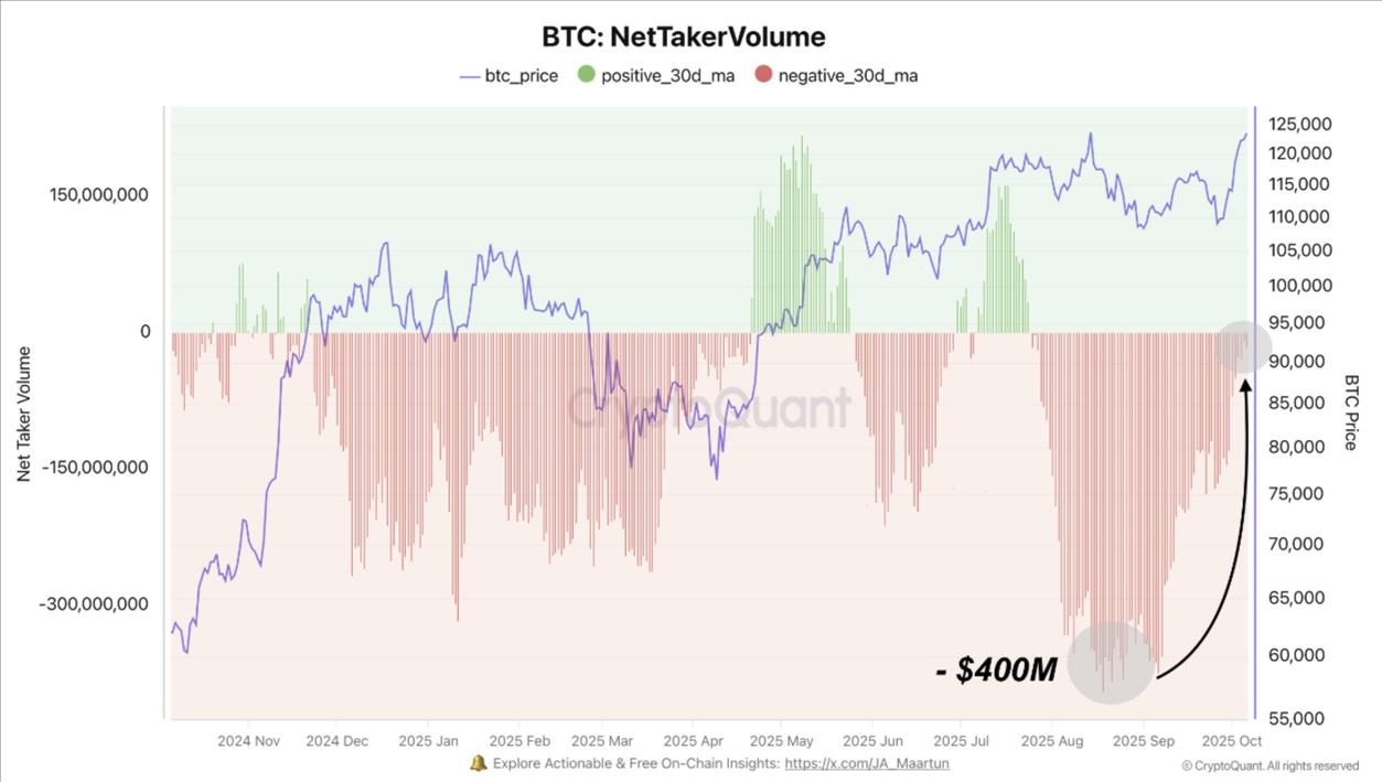 Bitcoin four-hour chart. Source: TradingViewAccording to CryptoQuant , the medium-term derivatives market trend has shifted notably. The net taker volume, representing the balance of buy and sell orders, has rebounded from an excessively bearish –$400 million to a neutral level, indicating a genuine shift toward buyers gaining relative market control.