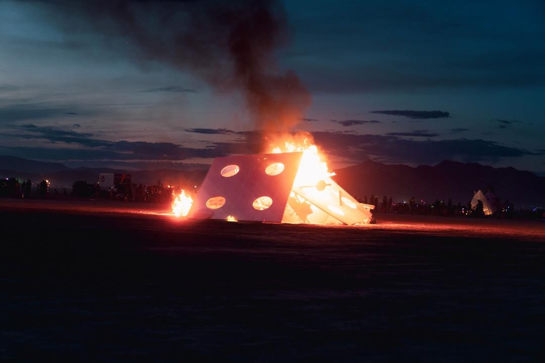 Among the hardest hit: Mona DIE! DIE! DIE!, the final piece in a trilogy by artist Miao He, following the 30-foot pink Mona Bunny and the towering Mona Mushroom. The sculpture - a giant wooden die painted in bright pink hues - was designed to explore themes of destiny and chance, chaos and impermanence, and invited participants to step into the unknown with curiosity and just“roll with it.” And this year, the playa surely did provide plenty of chaos to embrace: