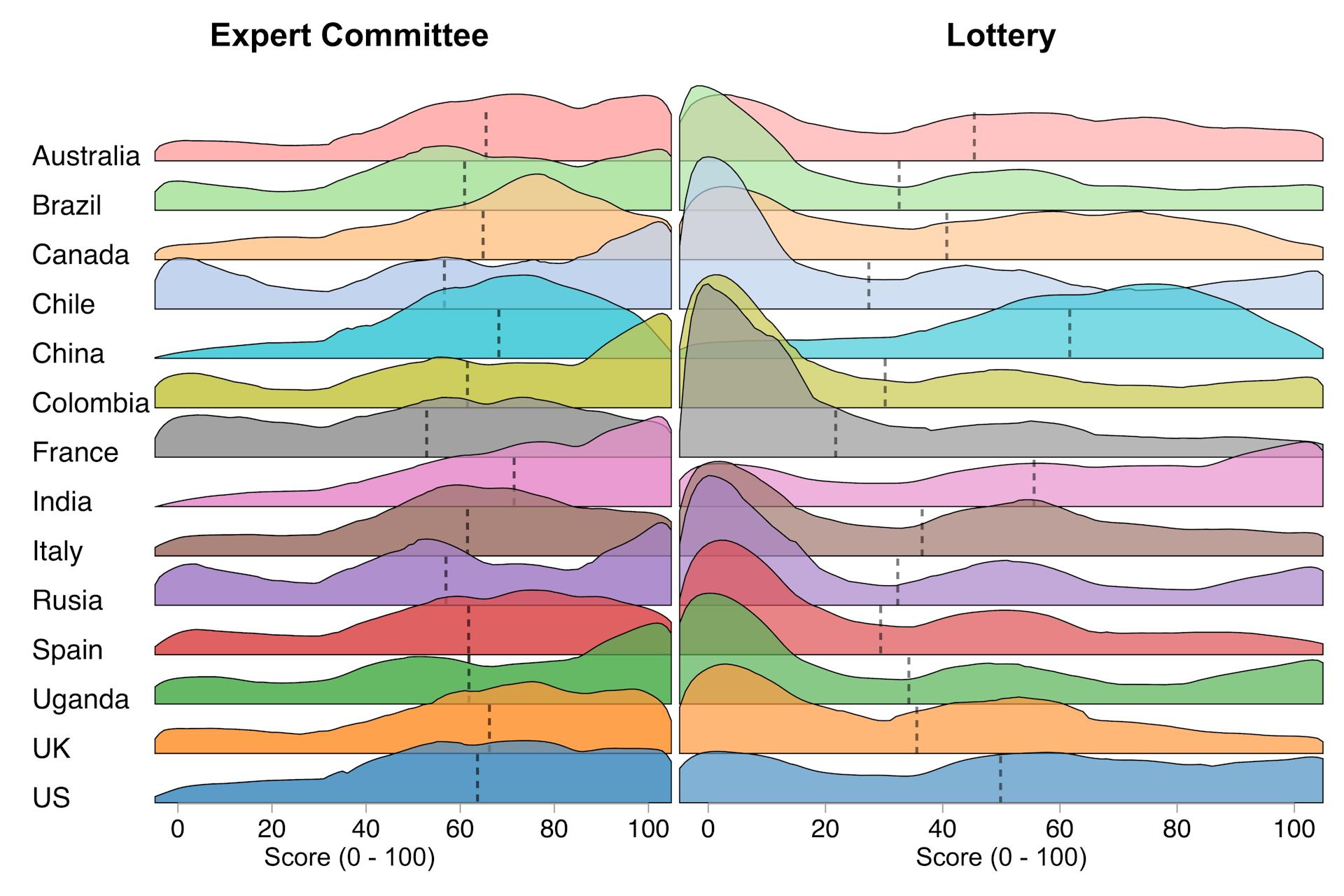 On average, expert committees scored 61, compared with just 37 for lotteries. While expert allocation was more acceptable everywhere, support for lotteries varied sharply across countries – from strikingly low in France and Chile to relatively high in China, India and the US.