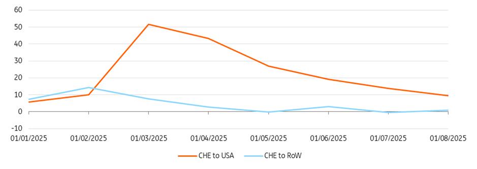 The downward trend is already clear, however. Much like in the eurozone, momentum is weakening, and the full impact of the August tariffs is still to come. Assuming all else remains equal, we expect Swiss exports to the US could decline by up to 20% in the short term due to the tariff shock.