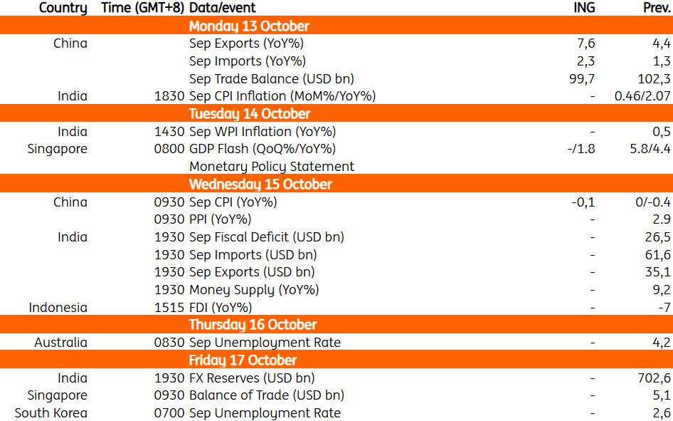 China: Exports expected to rebound while deflation continuesChina is set to publish data on trade and inflation for September. Trade figures are likely to show external demand remains a key driver of growth for the Chinese economy. We expect exports to rebound to 7.6% YoY in September. Imports are likely to see a milder uptick to 2.3% YoY, contributing to a trade surplus of around $99.7bn on the month. Inflation looks likely to have stayed in deflationary territory in September, with our CPI forecast set at -0.1% YoY. We should continue to get more Golden Week economic data in the coming days. Thus far, we've seen solid travel numbers but some disappointing box office and consumption data. This suggests domestic demand could still benefit from further policy support.