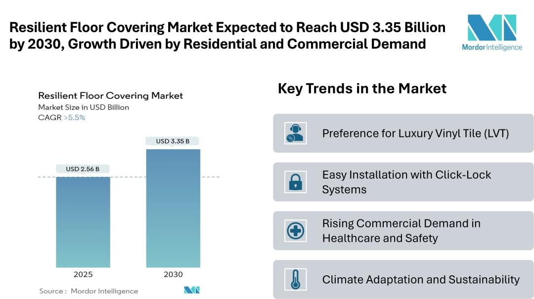 According to Mordor Intelligence, the Resilient Floor Covering Market size is valued at USD 2.56 billion in 2025 and is forecast to reach USD 3.35 billion by 2030, reflecting a 5.5% CAGR. Products such as luxury vinyl tiles (LVT) and stone plastic composites (SPC) are gaining popularity due to their ability to combine functionality with aesthetic appeal. The Resilient Floor Covering Market trends indicate a shift toward more innovative and convenient flooring options.