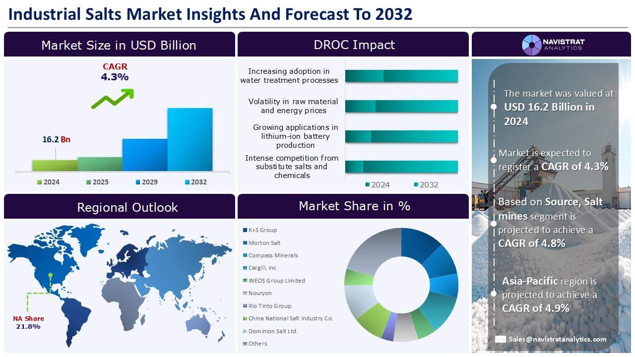 Industrial Salts Market is USD 16.2 billion in 2024 and is projected to register a CAGR of 4.3%