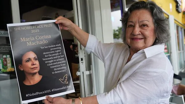 Machado, an opposition leader barred from running in Venezuela's 2024 presidential election, was awarded“for her tireless work promoting democratic rights for the people of Venezuela and for her struggle to achieve a just and peaceful transition from dictatorship to democracy”, the committee said.