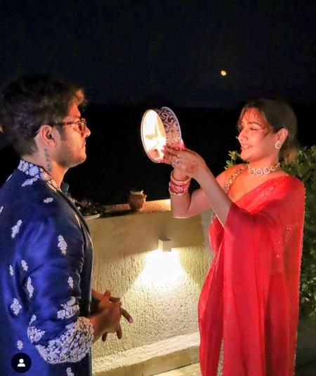 In the pictures, Surbhi Chandna looked radiant in a shimmery pink and golden saree, paired with matching jewellery - a statement neckpiece, earrings, and bangles. One of the photos captured the actress looking at Karan through a sieve, while another showed her lovingly breaking his fast by offering him water. A heartwarming video featured Karan planting a sweet kiss on Surbhi's cheek.