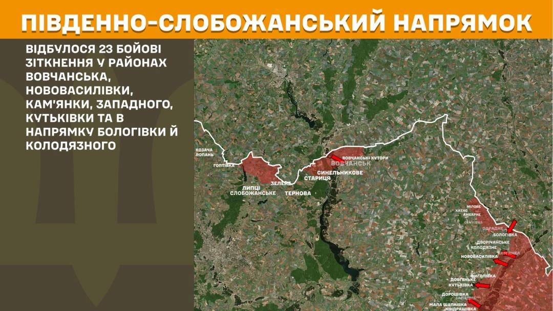 In the Southern Slobozhanshchyna sector, 23 clashes occurred near Vovchansk, Novovasylivka, Kamianka, Zapadne, Kutkivka, and toward Bolohivka and Kolodiazne.