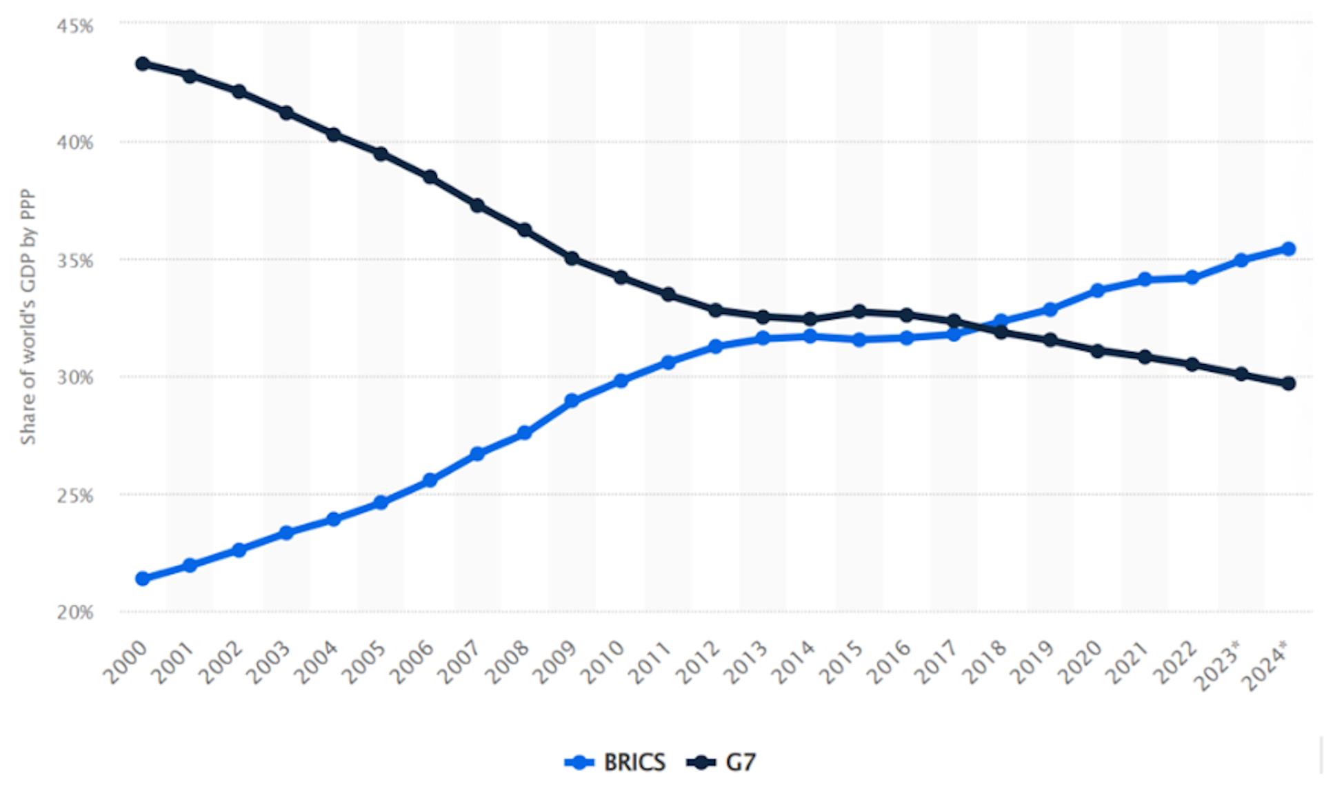 Figure 1: Brics surpassing the G7 in global GDP. IMF, 2024; Statista, 2025