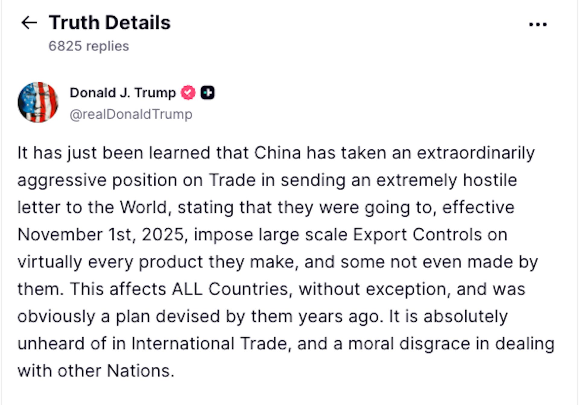 A part of US President Donald Trump's social media post announcing new tariffs on China. Who holds the upper hand: chips or rare earths?