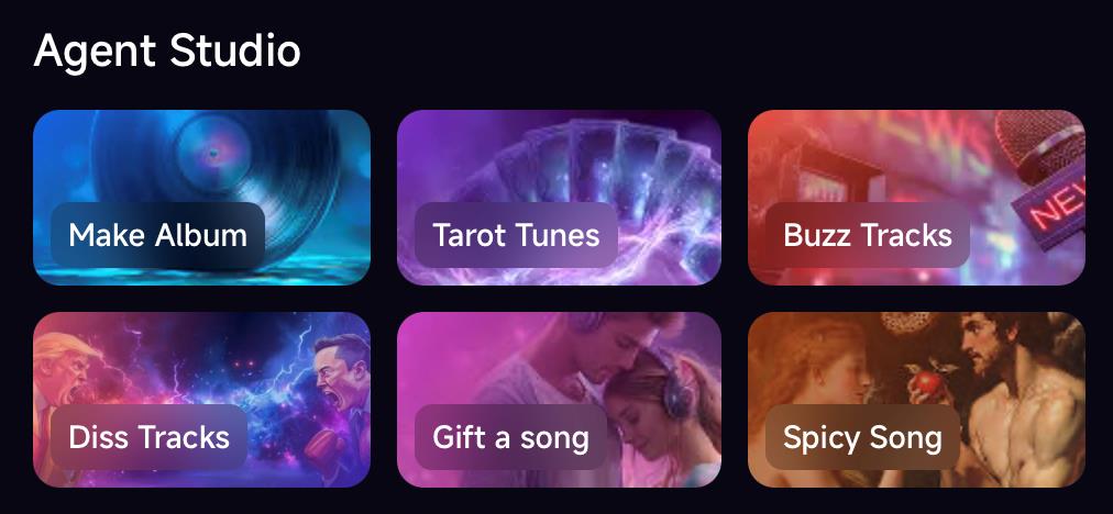 The initial release introduces six dedicated agents, each crafted for a distinct form of musical expression: Buzz Tracks, Tarot Tunes, Diss Tracks, Gift a Song, Spicy Song, and Make Album.