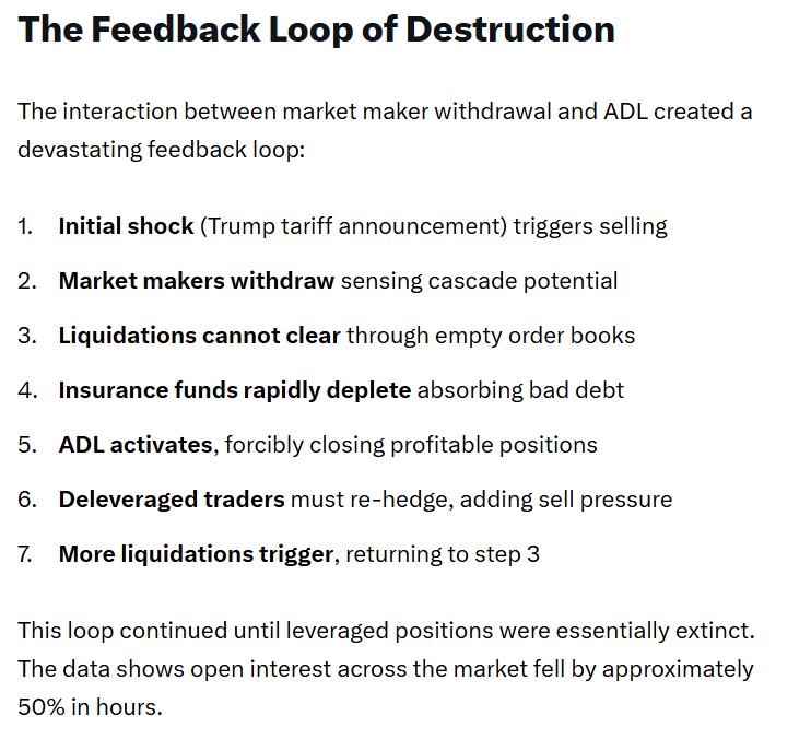 - Friday's crypto crash caused a record $19 billion liquidation, with open interest on decentralized exchanges plummeting from $26 billion to under $14 billion. Despite the chaos, data suggests most of the liquidation was a controlled, organic process, not a market cascade. Market participants recorded a peak of $20 million in lending protocol fees in a single day, alongside a surge in weekly DEX volumes exceeding $177 billion. Some analysts and blockchain data points indicate liquidity withdrawals by major market makers exacerbated the sell-off, creating a“liquidity vacuum.” Concerns about manipulation and withdrawal of liquidity persist, especially as some market makers reportedly abandoned their roles during critical moments.