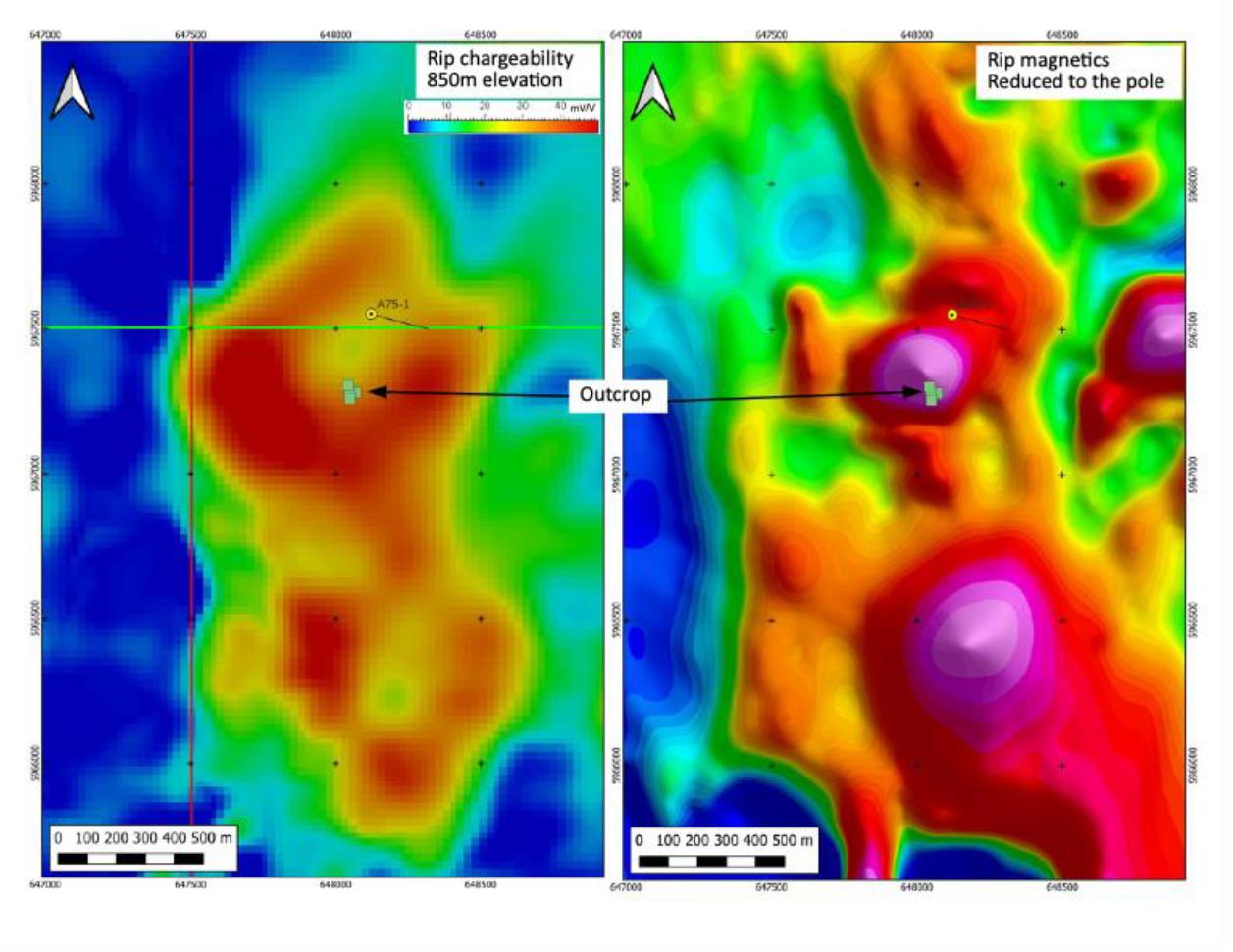 In 2024 two drill holes were completed on the northern geophysical target from a single setup, both intersecting anomalous to low-grade Cu-Mo porphyry mineralization from surface, and at depths >400m in RP24-001. Mineralization in both holes is hosted in three distinct phases of porphyritic intrusions with potassic to phyllic alteration and multistage veining (e.g., magnetite-chalcopyrite; quartz-chalcopyrite-molybdenite, pyrite-chalcopyrite with sericite haloes).
