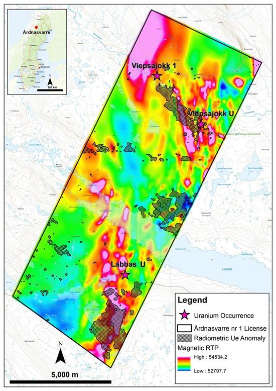 "The UAV magnetic survey results at the Labbas uranium occurrence indicates a magnetic low trough along the shoulder of a magnetic high where past drilling defined a historical resource estimate for uranium at the north-northwest end of a significant uraniferous boulder train. These recent magnetic results suggest that an extensive strike length remains untested by previous drilling at the Labbas occurrence. The Viepsajokk occurrence has never been drilled, and the potential bedrock mineralized source is also situated in a magnetic low trough along the shoulder of a magnetic high while also being at the north-northwest end of a significant uraniferous boulder train.