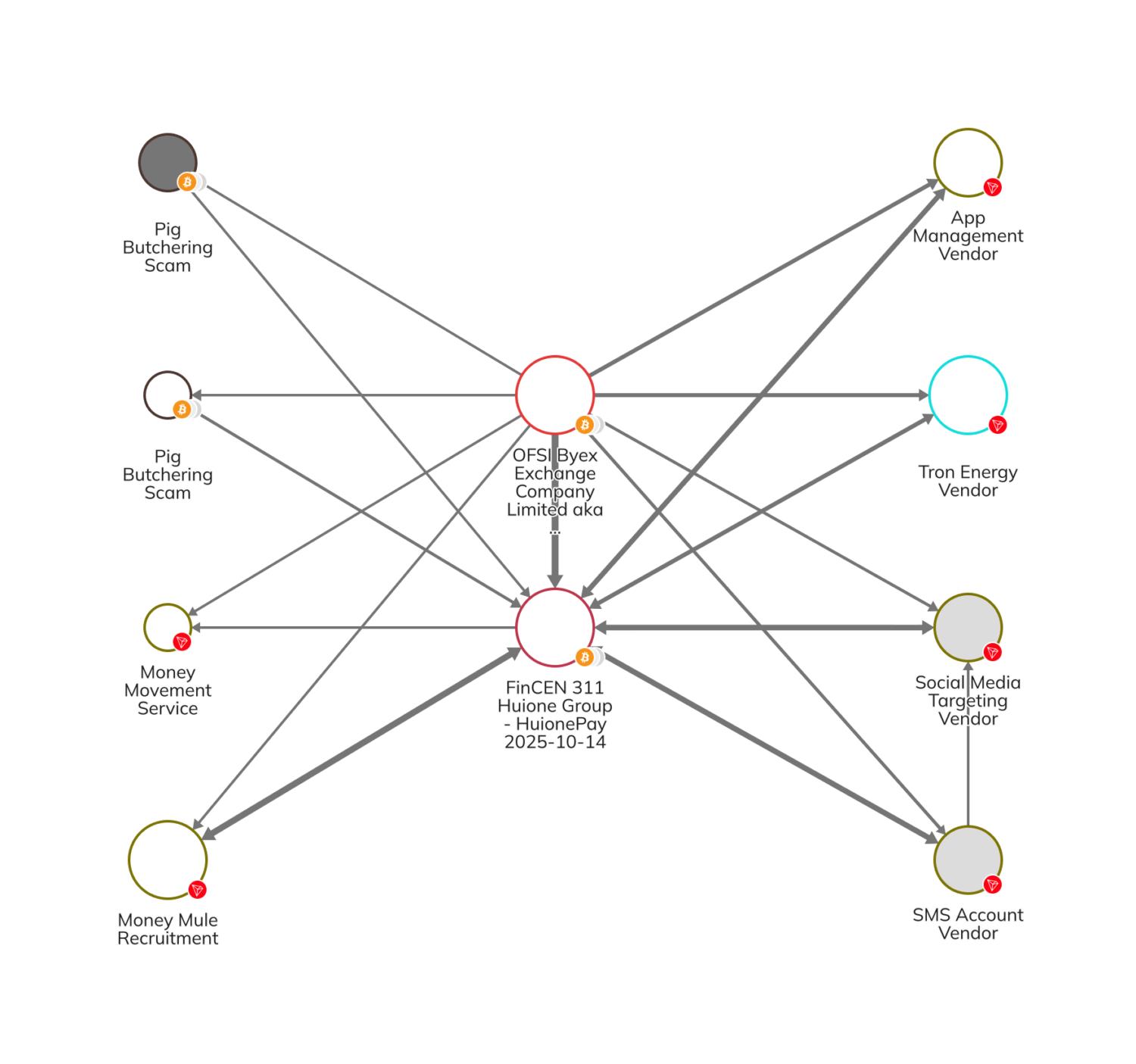 Lastly, OFSI's action against Byex Exchange further highlights the network utilized by Prince Group and Jin Bei. As seen in the Reactor graph below, Byex has interacted directly with Huione; and facilitated pig butchering scam payments, scam technology vendors such as social media targeting and SMS account vendors, and money movement services which help facilitate laundering of illicit proceeds.