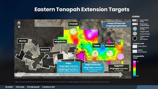 Structural and lithological data from the recently completed holes have been integrated into the Ruby vein model. Planning is now underway for a follow-up drill program which will be aimed at further targeting high-grade veins east of the Ruby discovery across the eastern extension of the historic Tonopah Mining District.