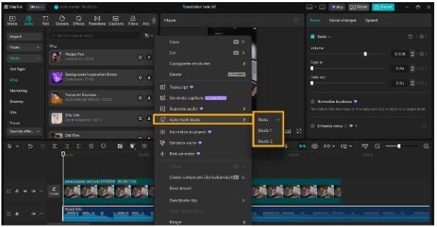 Right-click on the music track on the timeline. Click on "Auto mark beats" in the right-hand menu. CapCut Desktop Video Editor will analyze the track and show beat markers along the waveform.