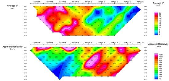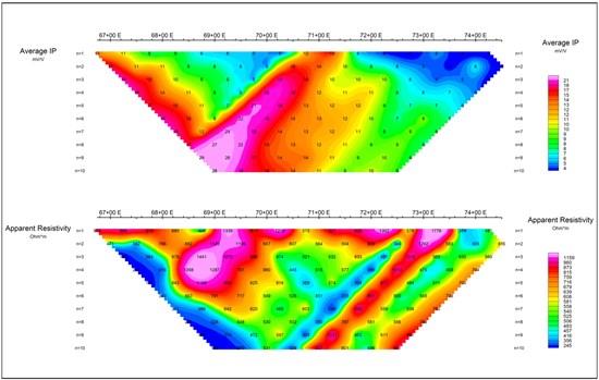 The Induced Polarization (IP) surveys were conducted using an inline modified (proximal) pole-dipole arrays with 50 m dipoles (L10300) and 25 m dipoles (L10580). Minimum current injection to potential dipole separation over the area of interest for L10300 was 500 m and for L10580 was 250 m.