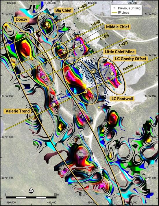 The initial IP survey was strategically centered around the main historic area to better understand the geological and structural settings, thereby supporting future drill targeting at Middle Chief, Big Chief, Little Chief & Valerie. To broaden coverage, the three northern lines were extended westward, specifically to investigate a non-magnetic density anomaly recently named "Doozy." This anomaly was identified by Gladiator from ongoing, highly detailed gravity surveys. The target had previously gone undetected by earlier explorers due to its low magnetic response. The gravity anomaly consists of two high intensity nodes that occur over approximately 600m of strike and are separated by what is interpreted to be the western continuance of the east-west trending mineralized "North Fault" that daylights in the northern wall of the historic Little Chief open pit located approximately 400m to the east.
