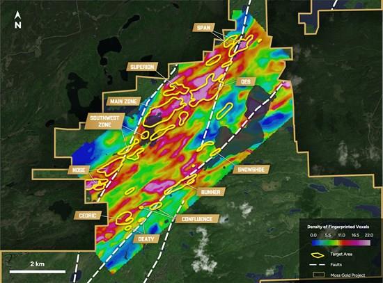 This geophysical "fingerprint" was highlighted across the survey area as prospective geophysical targets for Moss-style mineralization. This approach was successfully tested against the Moss Nose target area, where surface gold mineralization is hosted in a similar stratigraphic environment to the Moss Gold Deposit. Based on this successful correlation, additional "Moss fingerprinted" areas identified in the survey have been integrated into the targeting strategy.