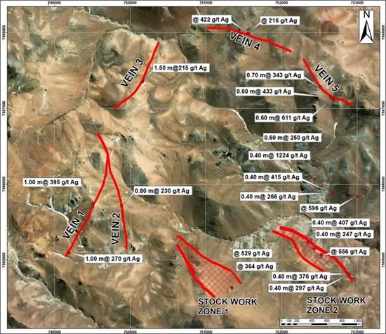 Our initial geochemical surface sampling reports the following results: Vein 1: 221 g/t Ag; Vein 2: 402 g/t Ag, Vein 3: 244 g/t Ag; Vein 4: 358 g/t Ag. The mineralized structure has an average width of 1.0 metre grading 311 g/t Ag.