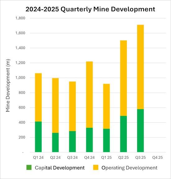 Mine performance for the quarter was also strong with 28,423 tonnes of mineralized material mined throughout the quarter, and a record 1,712 m of underground development completed during the quarter. The top three months of development at Tuvatu were all achieved during this quarter, surpassing the previous records set during the previous quarter. Mine development at Tuvatu has increased dramatically throughout 2025 as a result of the completion of the mine ventilation project, the addition of new mining equipment, and increasing the efficiency of mining methods and operations. With still additional equipment set to arrive on site, mine development is anticipated to increase further. The Company also completed production from the first ever shrinkage stope at Tuvatu, which was a major success and produced 5,704 tonnes of material at an average gold grade of 10.60 g/t. The company's second shrinkage stope is already in development and is anticipated to be twice as large as the first and will contribute to gold production in Q4 2025 and Q1 2026.