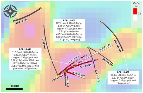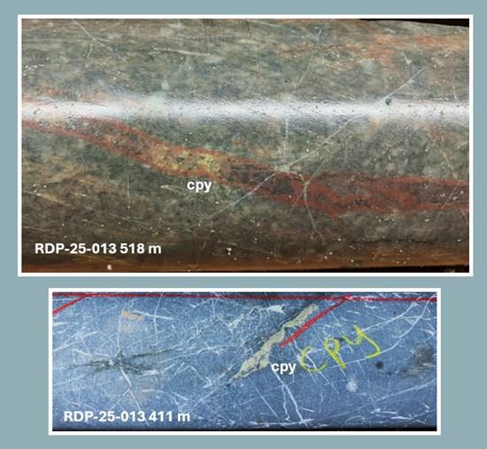 RDP-25-012 (48o /- 65o/363m length) and RDP-25-013 (160o /- 70o/582m length) were drilled from a site 170m northeast of RDP-22-005 to test the interpreted tabular porphyry Cu-Au mineralization geometry between RDP-22-005 and RDP-23-007, which was collared 300m NE of RDP-22-005 and ended in 19.0 m of 0.45% CuEq* or 0.67 g/t AuEq** (0.32% copper, 0.19 g/t gold, and 1.08 g/t silver)(see new release dated November 23, 2023). Chalcopyrite and bornite mineralization hosted in early-mineral, potassically-altered monzodiorite intrusive rocks and hydrothermal breccia were intersected (see Figures 5 and 6), which confirmed the concept of a tabular geometry. Copper-sulphide mineralization was intersected to a vertical depth of 500m in RDP-25-013 and it remains open.