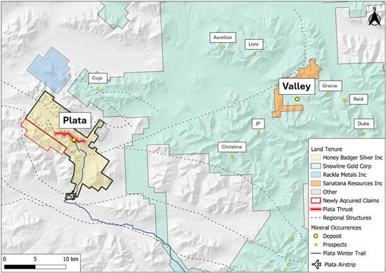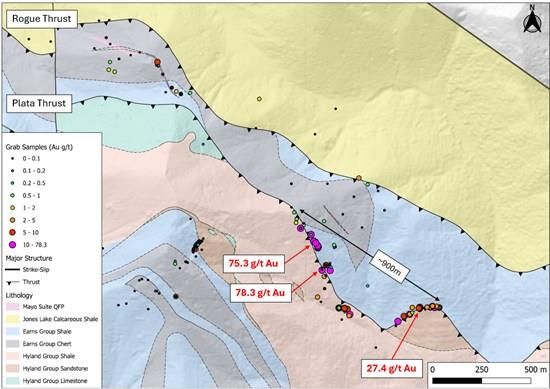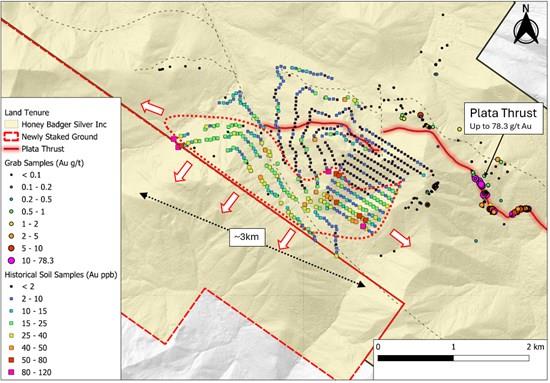 The Company's Executive Chairman, Chad Williams, commented, "Honey Badger continues to identify new and exciting target areas at Plata. This project has exceptional potential. We are particularly encouraged by the continuity of high-grade historical grab samples along the Plata Thrust which returned up to 78.3 g/t Au in outcrop as well as the potential for the Rogue Thrust to be an analog to the Plata Thrust. Additionally, a second zone of gold in soil has been identified and been traced for over 3 km and remains open in three directions. Of note, the Plata property is located adjacent to Snowline Gold's (TSXV: SGD) Rogue property, which contains 7.94M oz Au (M&I) at a grade of 1.21 g/t Au and 0.89M oz Au (Inferred) at a grade of 0.62 g/t Au (see SGD news release dated May 15, 2025)."