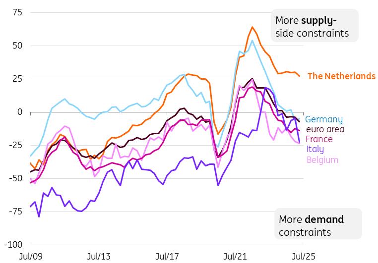 * Supply factors limiting production or sales concern lack of personnel, equipment, materials and/or space. ** Seasonally adjusted share of businesses in industry and commercial services that consider supply factors as most important limiting factor minus share that considers demand as most important constraint. Sector level data are weighted by the industry's share in gross value added in constant basic prices in 2023 Source: European Commission via Macrobond and Eurostat, calculations ING Research