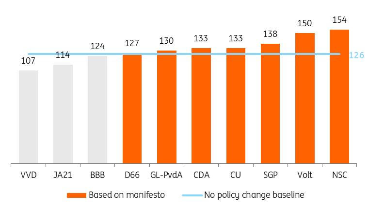 Looking at the possibilities of a majority government shows that there is a world of difference in terms of their preferred composition of the government budget, but less so when it comes to the degree of fiscal prudence. All of the major parties in the polls except PVV have presented their plans to the Netherlands Bureau for Economic Policy Analysis (CPB), which has modelled the economic outcomes of the plans. These parties all want to increase defence spending significantly. Except for JA21, all of them want to stay within the 3% of GDP budget deficit in the coming term. So, we don't expect the Netherlands to use the exception to the EU Stability and Growth Pact (SGP) for defence spending.
