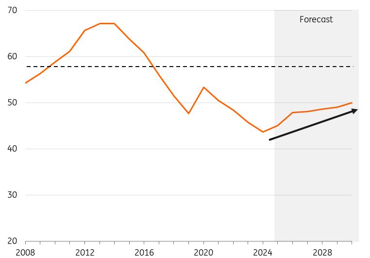 Projections are as of 2025. The proposed budget for 2026 and parliamentary amendments might mildly impact the debt ratio especially for 2026, but are not yet approved and therefore not taken into account Source: CPB (Netherlands Bureau of Economic Policy Analysis), graph by ING Research Polls suggest continued fragmentation