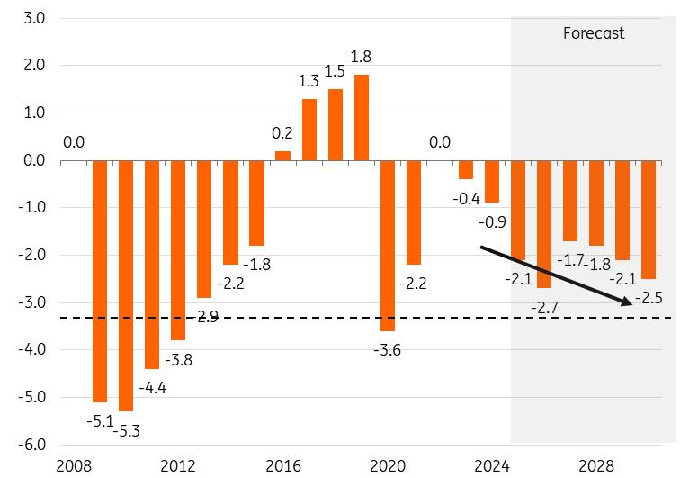 2026 contains one-off capitalisation of military pensions worth €8.5 billion (0.7% gdp). Projections are as of 2025. The proposed budget for 2026 and parliamentary amendments might mildly impact the budget balance especially for 2026, but are not yet approved and therefore not taken into account Source: CPB (Netherlands Bureau of Economic Policy Analysis), graph by ING Research