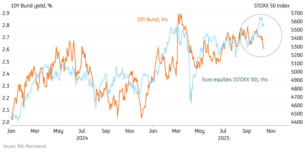 While equities seem to have recovered most of the losses from last week's renewed tariff fears, Bund yields paint a more pessimistic picture. The 10Y Bund yield is down to June levels, when there was significant macro uncertainty in the wake of Trump's 'Liberation Day'. Since then, the eurozone growth outlook and equities have improved materially, helping to push up euro rates. But somehow the past few days have seen a disproportionate drop in Bund yields, seemingly breaking the link with equities.