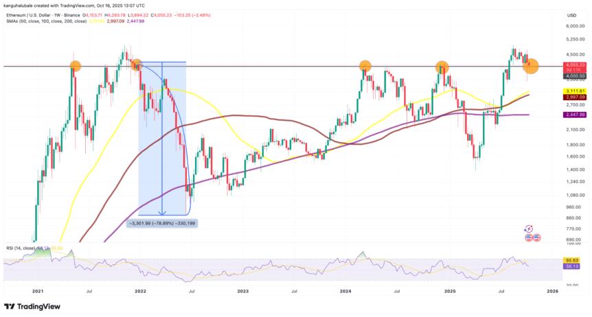 - Ethereum 's weekly MACD indicator flashed a bearish cross, echoing past declines of over 50%. Historic patterns suggest potential for significant ETH price drops if current signals materialize. Price must hold above $4,000 as a critical support to avoid deeper corrections. Crypto analysts warn investors to prepare for volatile scenarios ahead.