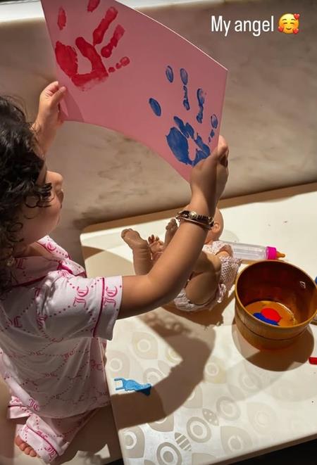 The photo dropped by the diva showed little Malti holding a chart paper with two paint hand prints on them. While one of the prints was in red, the other one was in blue. We could also see a small bucket of paint and a doll placed next to her.