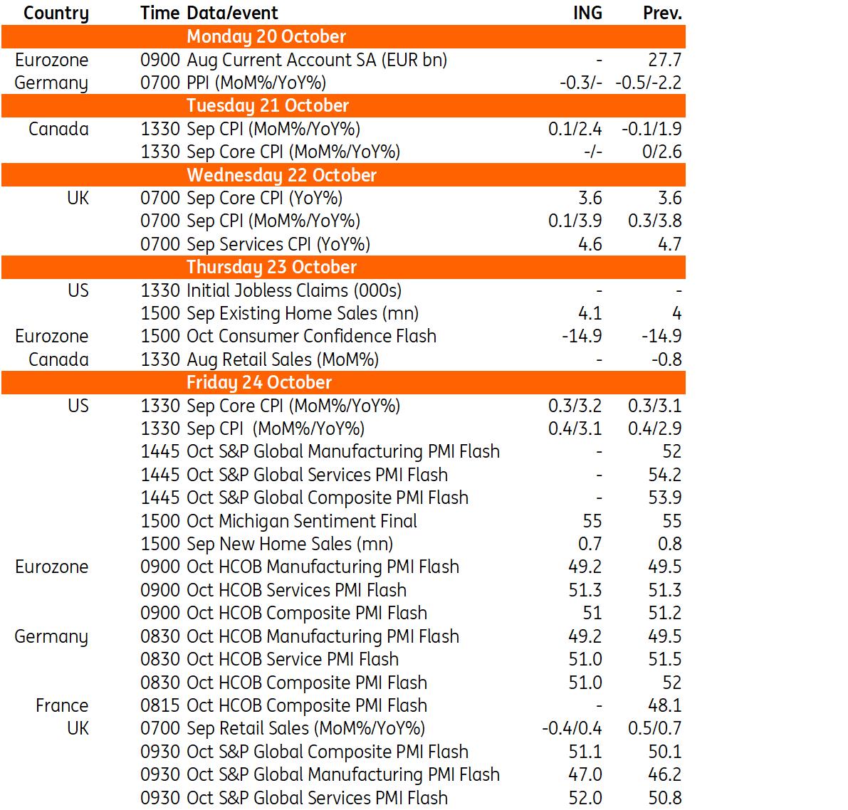 Inflation (Wed): Headline CPI is set to nudge higher, though mainly because the sharp fall in petrol prices this time last year wasn't matched to the same degree this September. This release should mark the peak in headline inflation, even if it's unlikely to fall materially before year-end. In better news, we expect services inflation to move lower, undershooting the Bank of England's August forecasts. In theory, that should move the dial towards further cuts, though for now officials are more focused on rising food inflation. We think that limits the chances of further BoE easing before February next year.