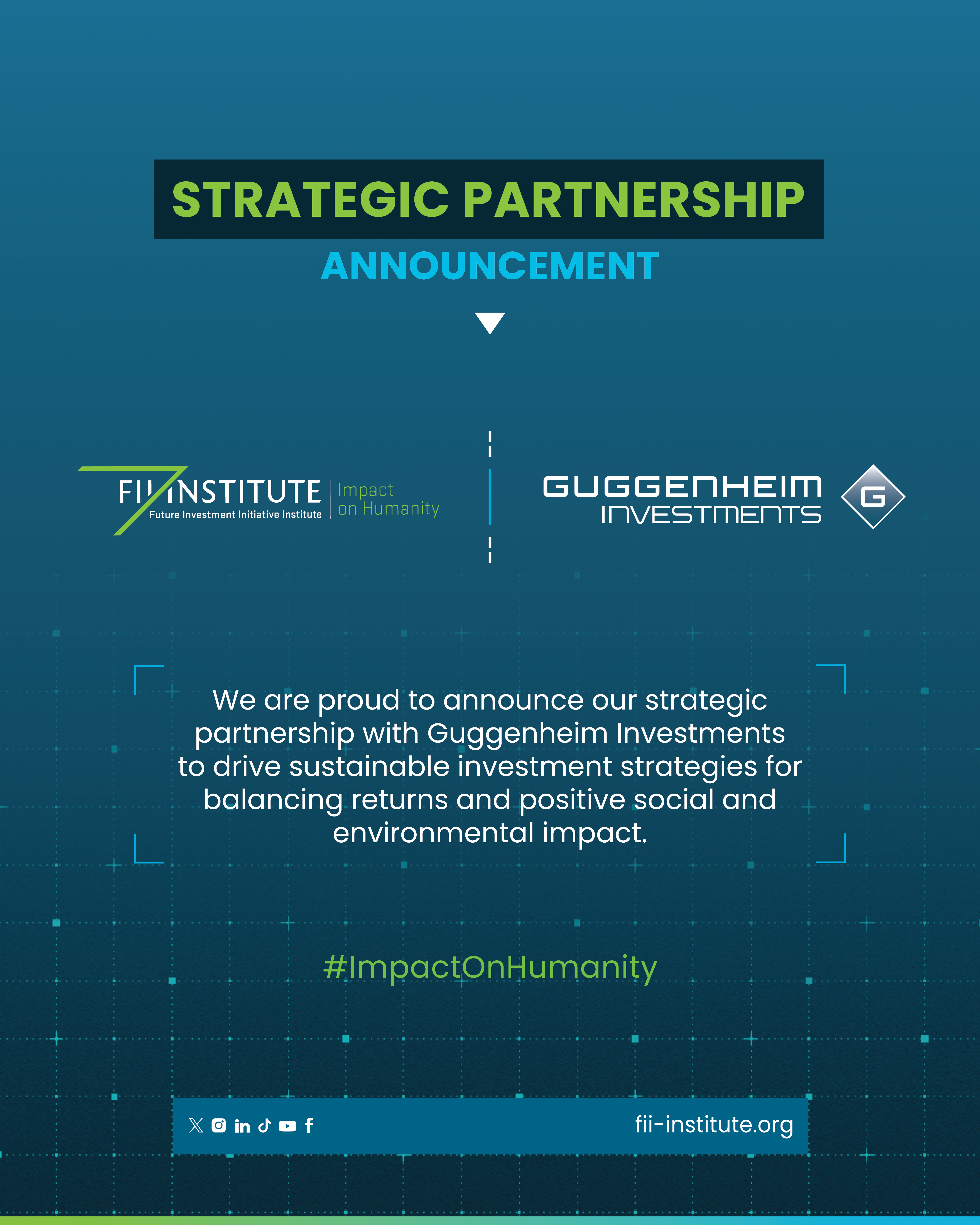 “Partnerships with leading firms like Guggenheim Investments strengthen our ability to advance solutions for the challenges that matter most. Their focus on long-term value creation and innovation aligns directly with our mission, and we are delighted to welcome them as a Strategic Partner as we prepare for FII9.” Dina DiLorenzo, President of Guggenheim Investments, said:“At Guggenheim Investments, our purpose is to provide long-term investment strategies that help build lasting value for communities and clients alike. The FII Institute's vision of Impact on Humanity mirrors our own commitment to stewardship and sustainable progress, and we look forward to contributing our perspective and insights to this important global platform.” As a leading global investment manager with more than USD 357 billion in total assets as of 30 June, 2025, Guggenheim Investments is distinguished by its long-term, research-driven approach and guiding principles of integrity, innovation, and stewardship. This focus complements FII Institute's mission to foster ideas, convene global stakeholders, and invest in scalable solutions that advance sustainable growth About Guggenheim Investments: Guggenheim Investments is a global asset manager with more than $357 billion1 in total assets across fixed income, equity, and alternative investments. The firm delivers differentiated strategies shaped by insight, discretion, and long-term alignment. With deep intellectual capital and cultural intelligence, Guggenheim Investments serves the world's most sophisticated investors. A company of TWG Global, Guggenheim Investments sets a new standard in asset management, defined by precision, purpose, and enduring value. About FII Institute: The Future Investment Initiative (FII) Institute is a global non-profit foundation with an investment arm and a single agenda: Impact on Humanity. Global, inclusive, and data-driven, the Institute brings together the world's brightest minds to transform ideas into real-world solutions across for critical pillars: Artificial Intelligence & Robotics, Education, Healthcare, and Sustainability.