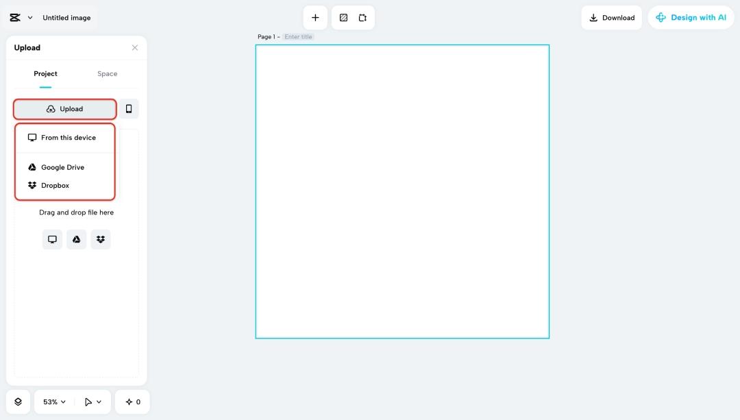 Go to CapCut Web and hit "Create a new image." Then click "+" and select "Upload", and on the left panel, you'll again see the "Upload" button. You can now choose an image directly from your device, Google Drive, or Dropbox, or simply drag and drop your photo right into the workspace. Drag and drop your photo - whether it's a product shot, portrait, or social graphic. The editor loads it instantly.