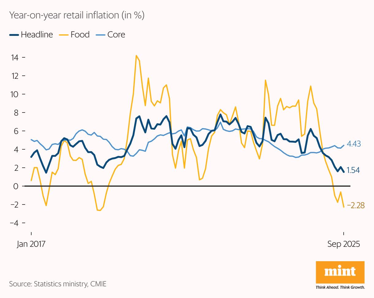 Retail inflation eased to 1.54% in September from 2.07% in the preceding month, driven by lower prices of vegetables and pulses and the statistical effect of a favourable base. This marks the lowest reading since June 2017. This is the second time in three months that inflation slipped fallen below the Reserve Bank of India's (RBI) lower tolerance limit of 2%. Core inflation, on the other hand, surged to a two-year high of 4.43% due to a sharp rise in prices of gold and silver. Economists expect inflation to cool further in October to sub-1% due to a stronger base effect, as well as the impact of goods and services tax (GST) rate cuts playing out.