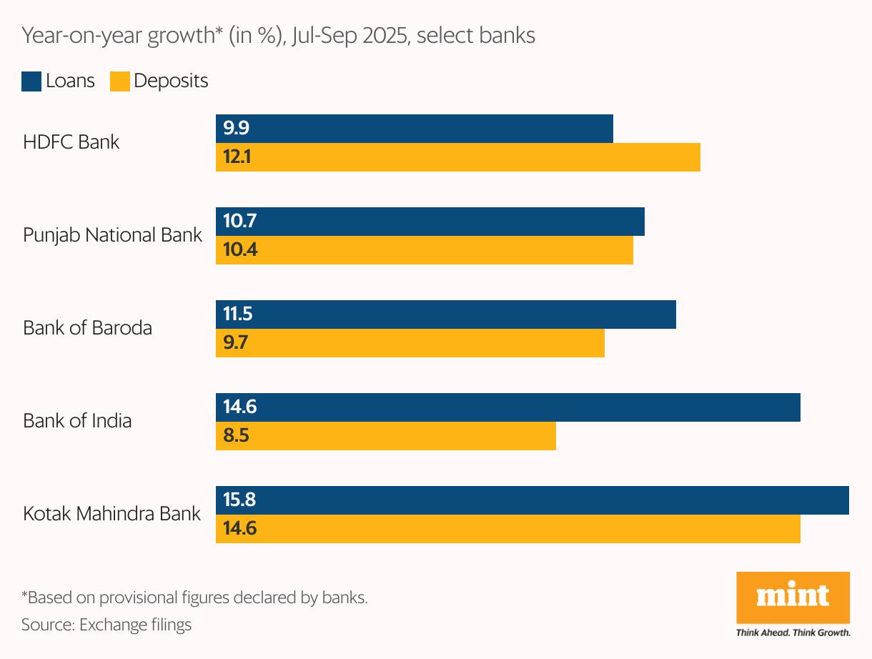 Growth in Indian banks' deposits lagged credit growth during the September quarter, provisional figures released by banks showed. This marks a reversal from the previous quarter, when growth in deposits had kept pace with loans. According to RBI data, as on 19 September, India's overall credit growth was 10.4%, while deposits grew only 9.5%. The trend could be attributed to the cumulative 100 basis point rate cut by the RBI that may have boosted credit as loans got cheaper, but discouraged deposits due to lower returns. Banks rely on deposits to access low-cost funds for lending, hence their growth is crucial.