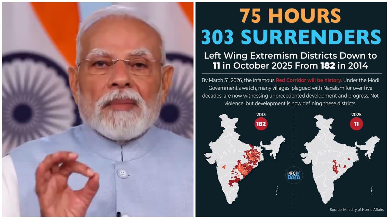 "The Constitution was in force in the rest of the country, but it was completely missing in the Red Corridor. And I say this with full responsibility that those who touch their head with Constitution book even today work day and night to protect these Maoist terrorists who do not believe in the Constitution at all," he said. The Prime Minister said governments were elected, but they had no authority or recognition in the Red Corridor. "As evening fell, it became difficult for anyone to step outside their homes. Even those responsible for providing security to the public had to move around with security for themselves. Over the past 50-55 years, thousands of people have been killed because of this Maoist terrorism. Countless security personnel have fallen victim to it, and we have lost so many young lives," he said.