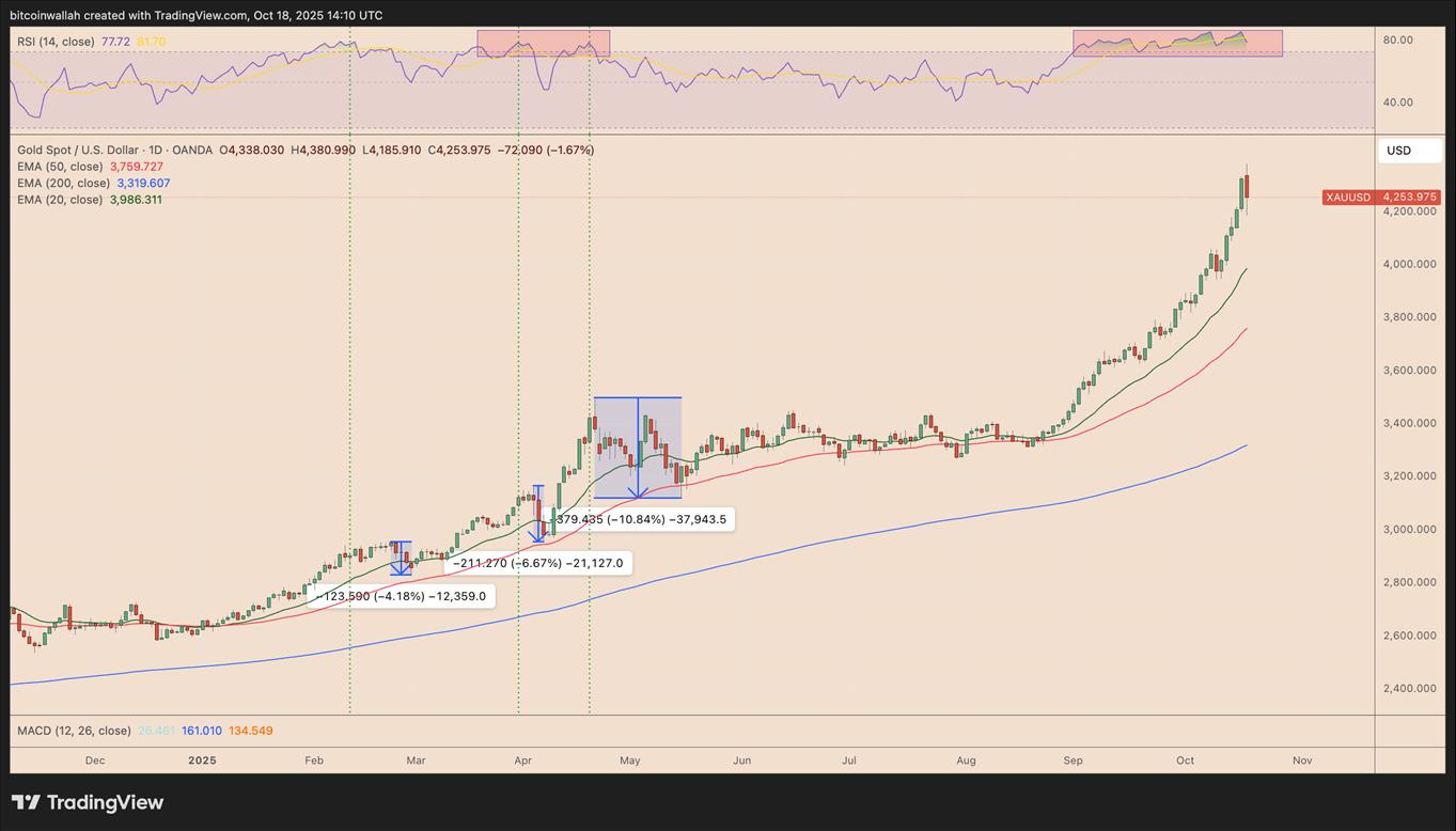 Bitcoin (BTC ) is showing early signs of recovery as gold (XAU) fluctuations suggest a potential reversal. After peaking at around $4,380 per ounce last Friday, gold has retraced nearly 3%, despite a year-to-date gain of over 62%. The metal's daily relative strength index (RSI ) readings have remained above 70, indicating overbought conditions and potential profit-taking, which has coincided with a nearly 4% rise in Bitcoin from its four-month low near $103,535.