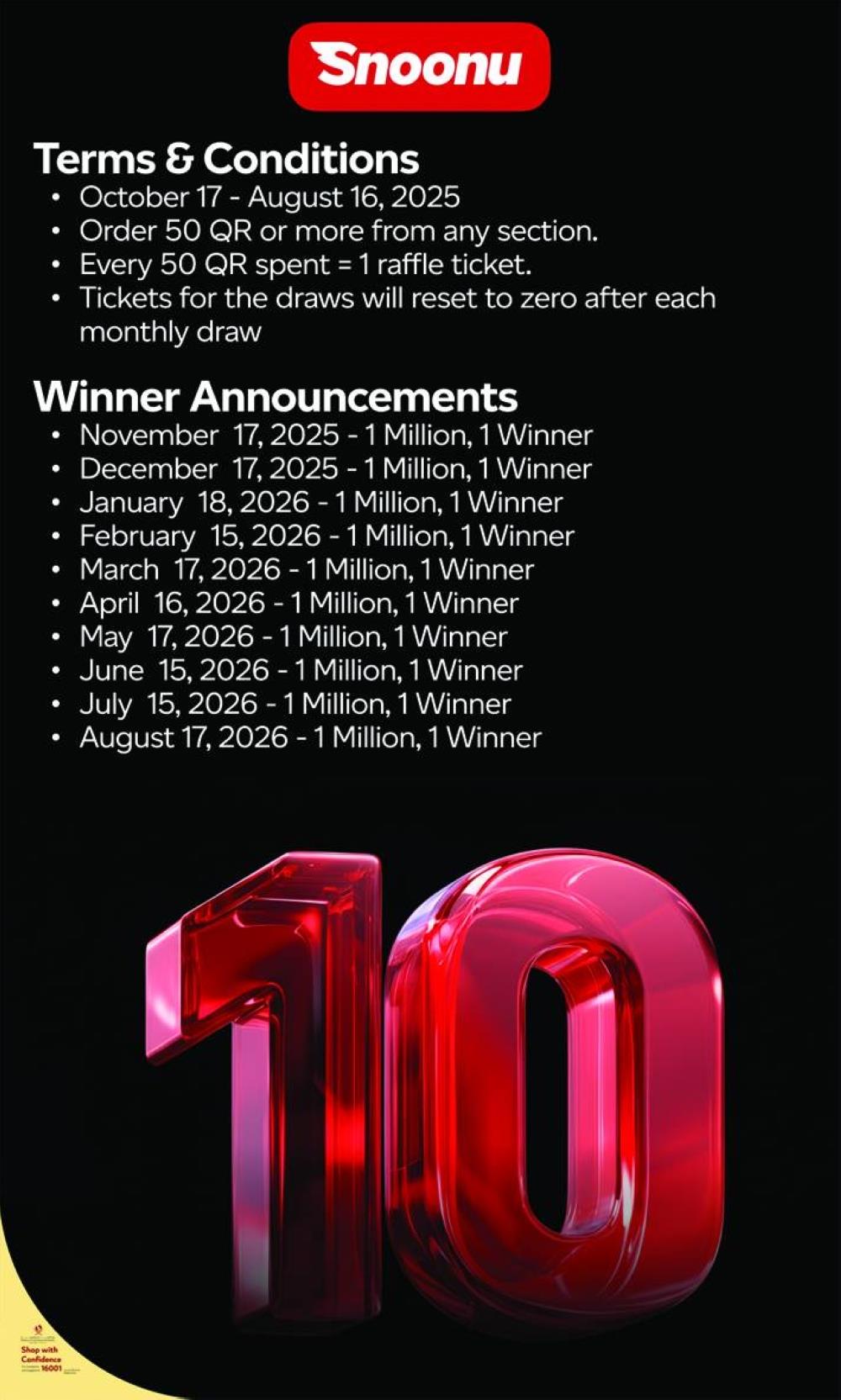 During the event, it was announced that from Oct 17, 2025, to Aug 16, 2026, every order worth QR50 (from any section) earns one raffle entry. Tickets reset after each monthly draw, and on each date, one winner will receive QR1mn Millions Await