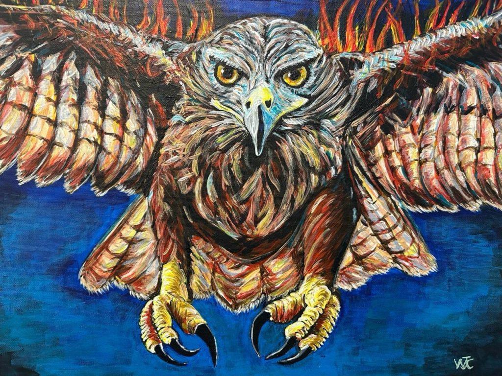 The first of his recent works depicts a powerful eagle, wings outstretched, descending from a burning horizon. The flames ripple behind it, symbolizing both destruction and purification. Its eyes - sharp, golden, and commanding - pierce through the canvas, meeting the viewer with defiance and majesty.