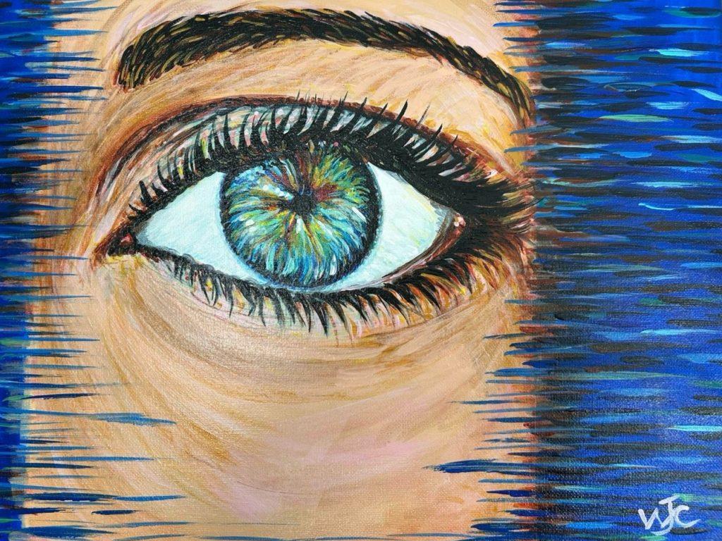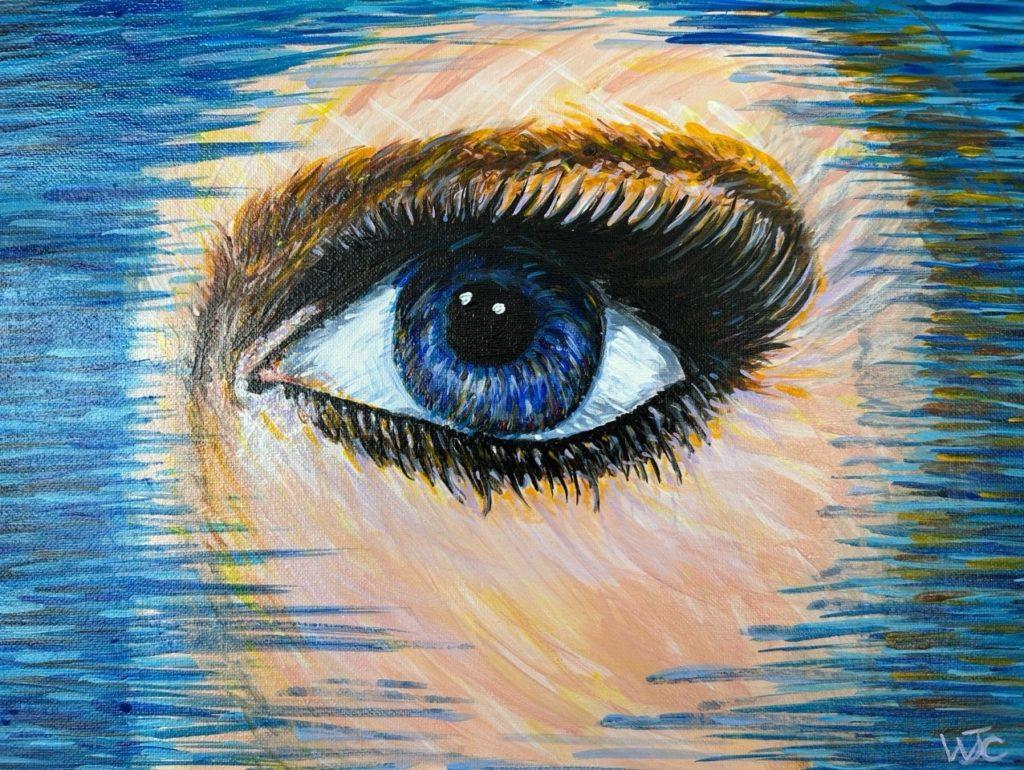 The second work shifts tone - a hauntingly beautiful close-up of a human eye, painted with hypnotic precision. The iris gleams with layers of turquoise, amber, and green, radiating light as if holding a galaxy within. The surrounding brushstrokes blur into streaks of blue, creating the illusion of motion - perhaps time, thought, or memory flowing past.