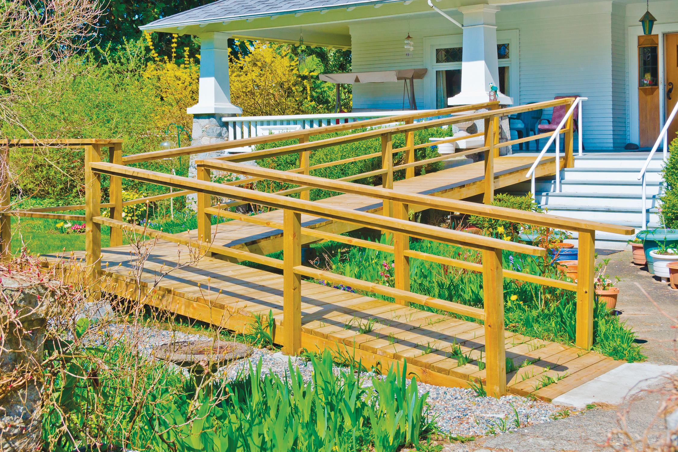 For older adults, steps to the front door can be an obstacle. A ramp or zero-step entry allows for easier coming and going, and a covered porch or awning keeps walkways dry.