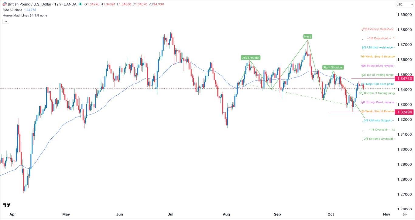 EURUSD Chart by TradingViewGBP/USD Technical AnalysisThe 12-hour chart shows that the GBP/USD exchange rate has pulled back in the past few days, moving from a high of 1.3473 to 1.3400. It has found substantial resistance at the 50-period Exponential Moving Average (EMA).The pair has also formed a head-and-shoulders pattern, which is a common bearish reversal sign. It remains slightly below the Major S/R pivot point of the Murrey Math Lines tool.Therefore, the pair will likely continue falling as sellers target this month's low of 1.3250. A move above last week's high of 1.3473 will invalidate the bearish outlook.Ready to trade our daily Forex signal? Check out the best forex brokers in the UK worth using.