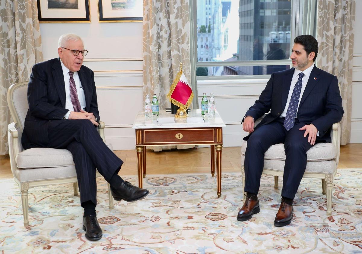 New York: Governor of Qatar Central Bank (QCB) and Chairman of Qatar Investment Authority HE Sheikh Bandar bin Mohammed bin Saoud Al-Thani met with Co-Founder and Co-Chairman of the Carlyle Group David Rubenstein, along with the accompanying delegation, during his visit to New York, United States of America.